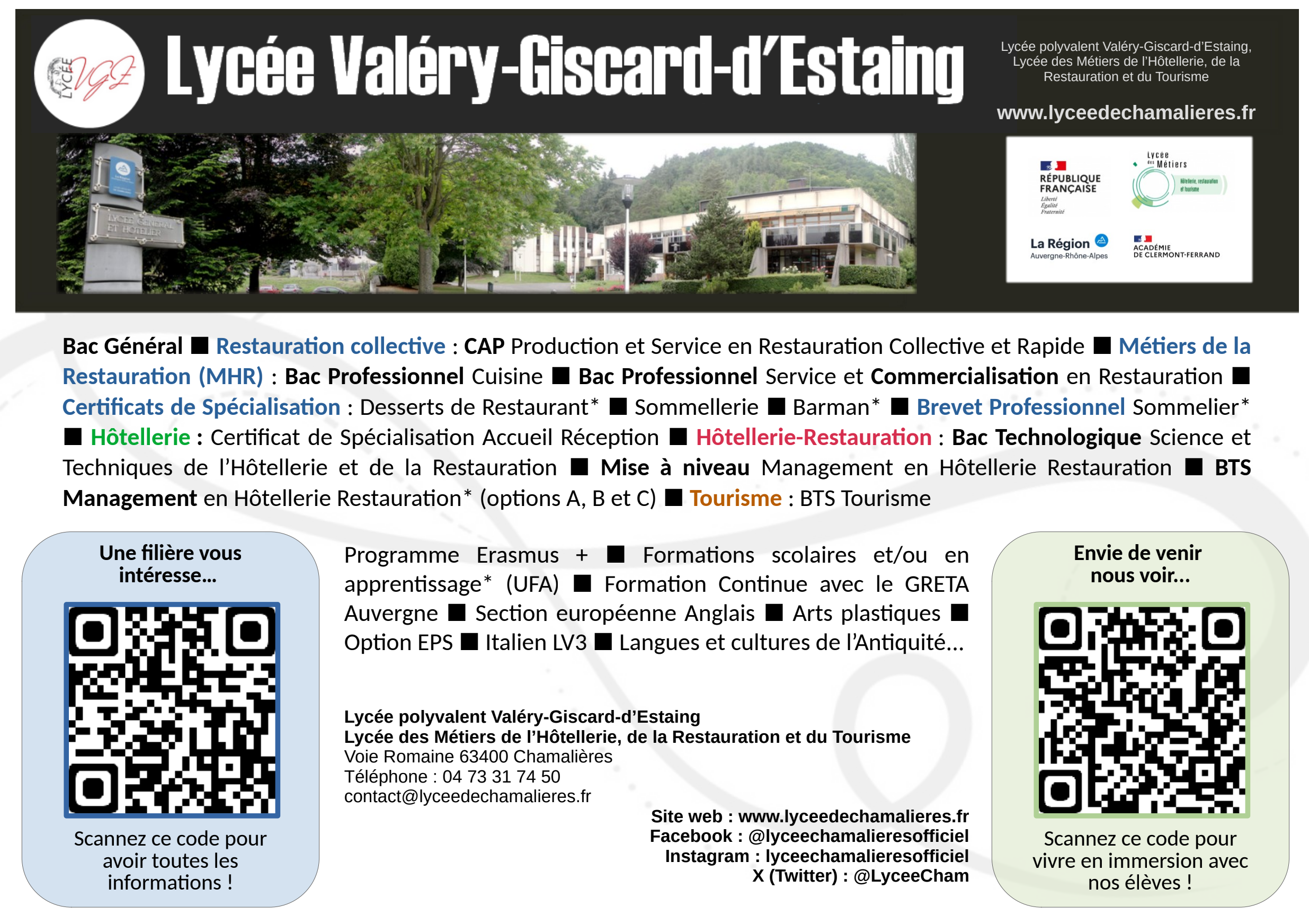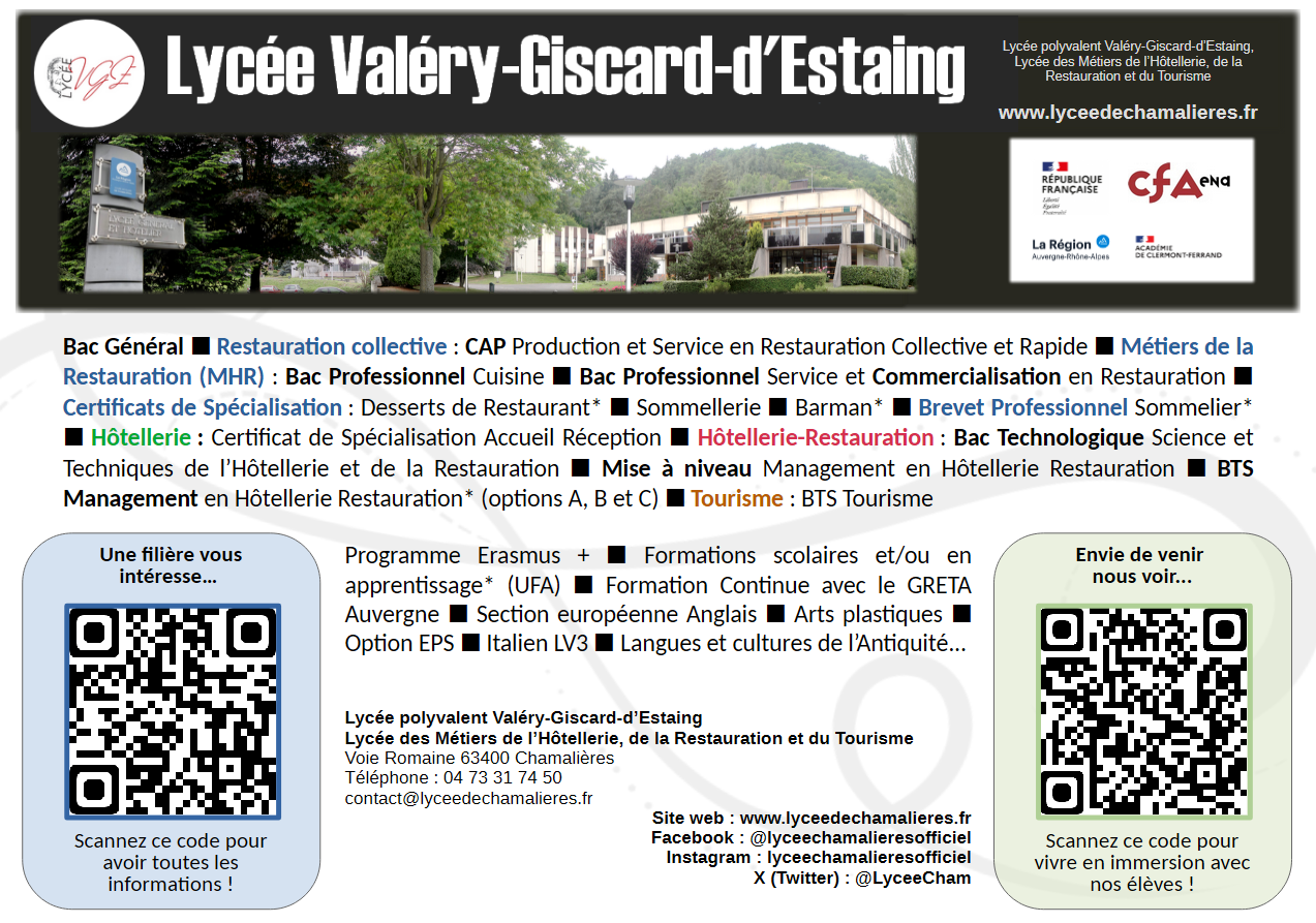 - Voie professionnelle : Baccalauréat Métiers de l’Hôtellerie-Restauration (MHR) avec deux spécialités, cuisine ou commercialisation et services en restauration (vœux à saisir dans Affelnet)
