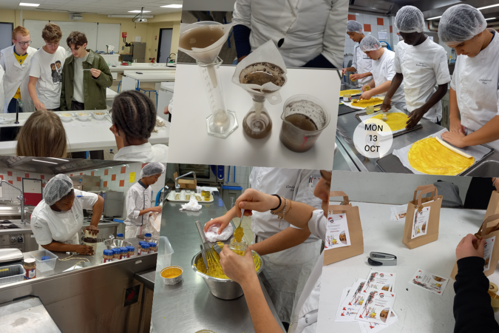 Ce projet est aussi le fruit d’un long travail scientifique et technique. En biotechnologies avec Madame Zanni, les élèves ont mené une première année d’expérimentations en laboratoire de chimie : décomposition de la recette, filtration de l’eau du robinet, étude de l’hygiène alimentaire et compréhension des procédés de fabrication. Les différentes recettes ont nécessité de multiples étapes de tests, d’assemblages et d’ajustements. La recherche de la texture idéale, de la couleur souhaitée et des contenances adaptées s’est étalée sur plusieurs mois, donnant lieu à des dégustations, des comparaisons et des votes collectifs. Les élèves ont également calculé les valeurs énergétiques réglementaires du produit et conçu l’étiquette, dans le respect des normes en vigueur, complétant ainsi leur démarche par une approche concrète des exigences professionnelles et réglementaires.