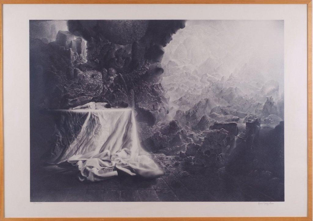 MARGOTTON montre une lithographie suggérant la part du rêve dans la figuration réaliste de rochers encaissés.